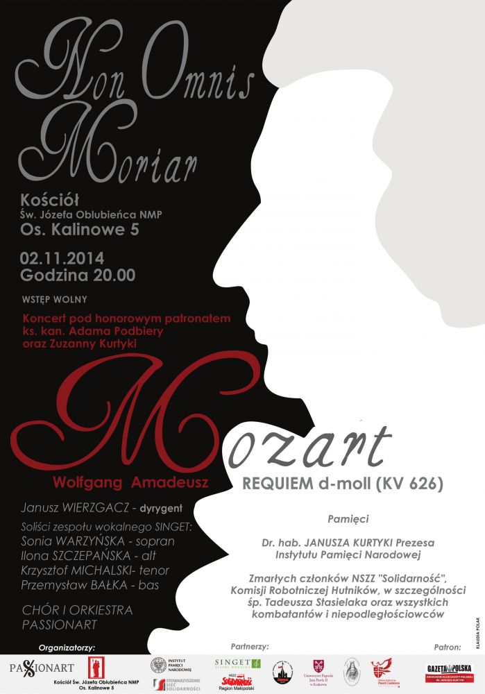 O godzinie 20:00 w koœciele œw. Józefa Oblubieńca NMP na os. Kalinowym 5 w Nowej Hucie zabrzmi jedno z najwybitniejszych i najbardziej znanych dzieł literatury muzycznej - Requiem d-moll Wolfganga Amadeusza Mozarta, w wykonaniu Chóru i Orkiestry Stowarzyszenia PASSIONART. W partiach solowych zaprezentujš się œpiewacy na co dzień zwišzani z krakowskim zespołem wokalnym SINGET.