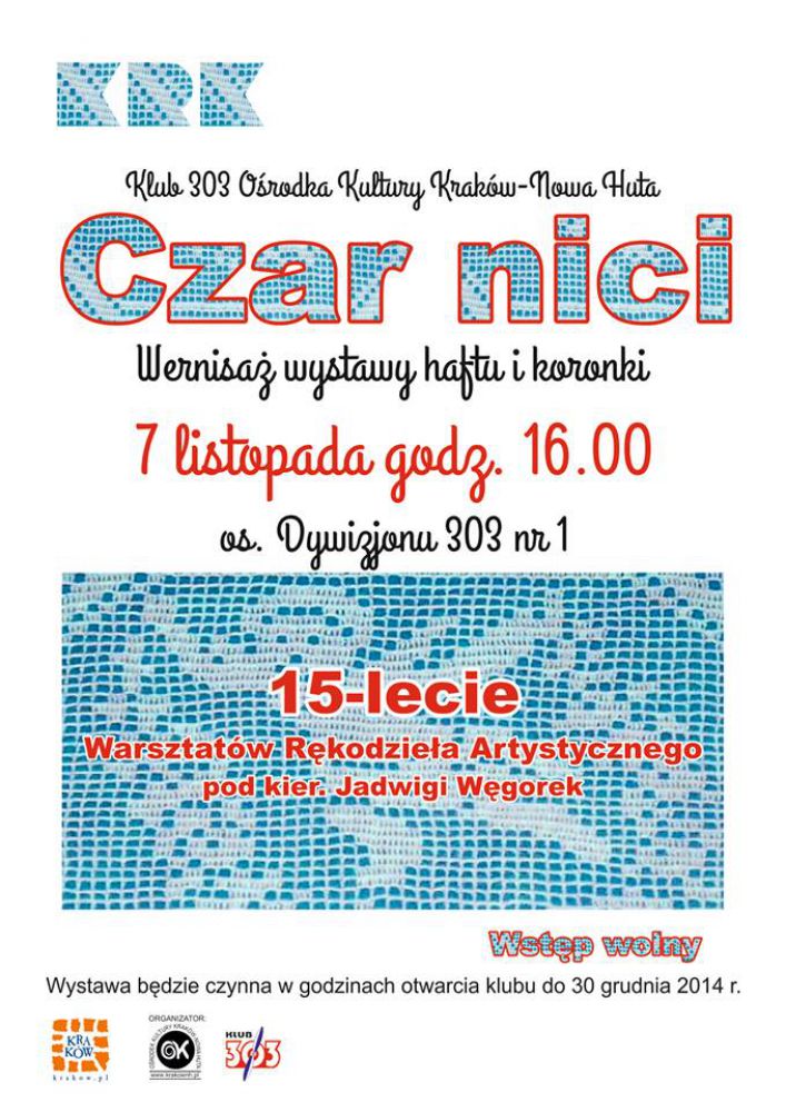 Klub 303 Orodka Kultury Kraków-Nowa Huta (os. Dywizjonu 303 nr 1) zaprasza 7 listopada 2014 r. o godz. 16.00 na wernisaż wystawy prac hafciarskich i koronkarskich powstałych w ramach Warsztatów Rękodzieła Artystycznego Czar nici, prowadzonych przez Jadwigę Węgorek.