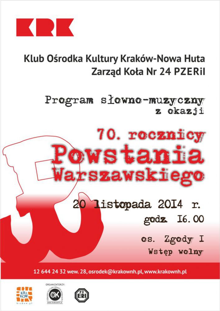 W 2014 r. obchodzimy 70. rocznicę wybuchu Powstania Warszawskiego. Z tej okazji Klub Oœrodka Kultury Kraków-Nowa Huta (os. Zgody 1) zaprasza 20 listopada 2014 r. o godz. 16.00 na program słowno-muzyczny będšcy wyrazem pamięci oraz uhonorowaniem poœwięcenia i walki Powstańców Warszawskich z 1944 r., który przygotował zespół Zawilec. W programie znajdujš się wiersze i piosenki powstańcze. Partnerem wydarzenia jest Zarzšd Koła nr 24 PZERiI.