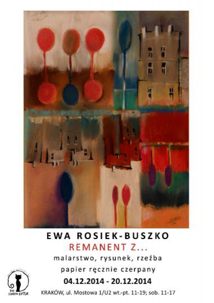 Galeria Artystyczna Pod Czarnym Kotem zaprasza na retrospektywnš wystawę prac Ewy Rosiek-Buszko pt. "REMANENT Z...". Na wystawie Artystka zaprezentuje prace pochodzšce z różnych lat i okresów twórczych, w tym pastele, rysunki, prace na papierze ręcznie czerpanym, asamblaże i wiele innych ciekawych dzieł.