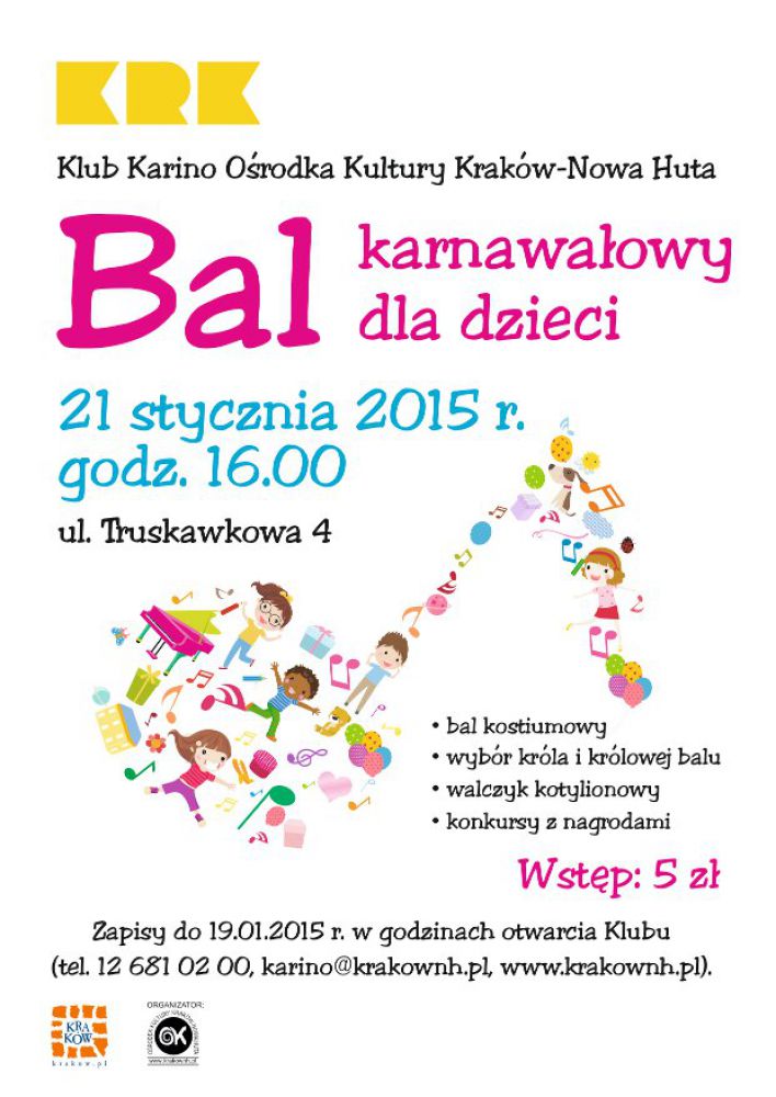 Klub Karino Orodka Kultury Kraków-Nowa Huta zaprasza na bal karnawałowy dla dzieci i młodzieży uczestniczšcej w zajęciach Klubu. Uczestnicy balu proszeni sš o przybycie w strojach karnawałowych lub przebranie się za postaci z ulubionych bajek. W programie imprezy zabawy i konkursy z nagrodami, wybór króla i królowej balu oraz walczyk kotylionów.
