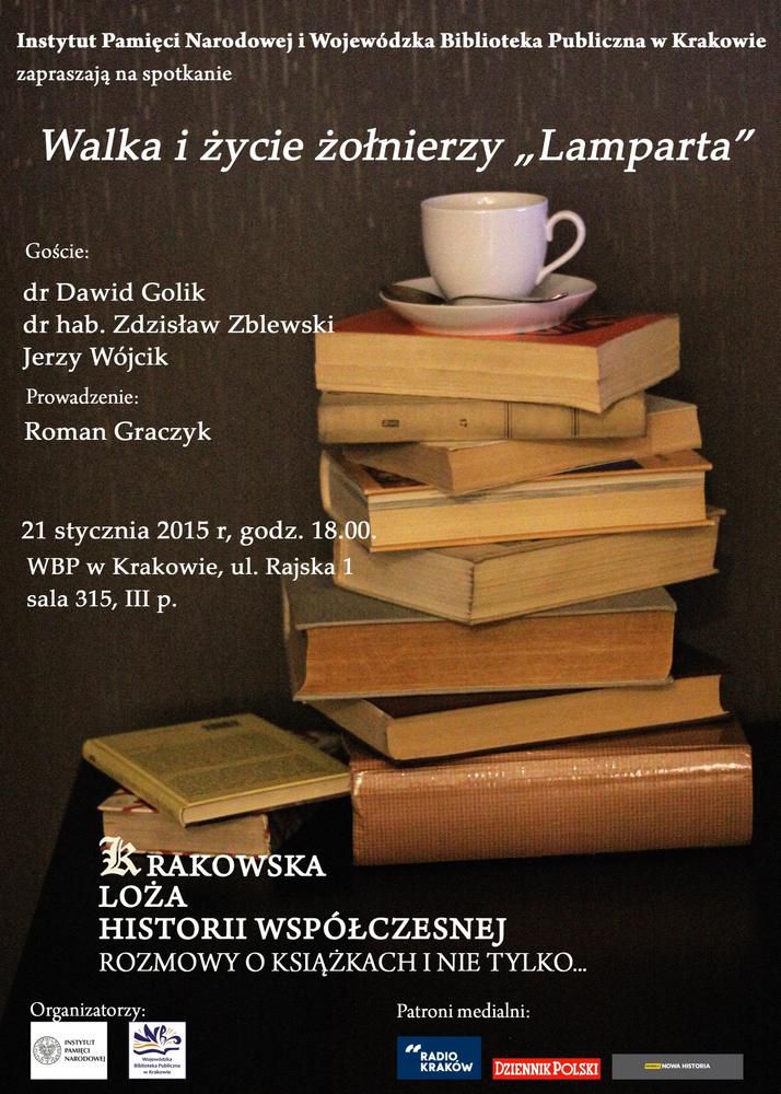 Instytut Pamięci Narodowej oraz Wojewódzka Biblioteka Publiczna w Krakowie zapraszajš na spotkanie Walka i życie żołnierzy Lamparta. W dyskusji wezmš dr Dawid Golik, dr hab. Zdzisław Zblewski oraz Jerzy Wójcik. Spotkanie poprowadzi Roman Graczyk.