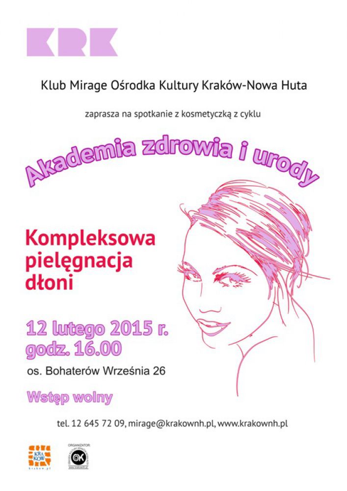Klub Mirage Orodka Kultury Kraków-Nowa Huta (os. Bohaterów Wrzenia 26) zaprasza 12 lutego 2015 r. o godz. 16.00 na spotkanie z kosmetyczkš dla pań w ramach cyklu Akademia Zdrowia i Urody. Uczestniczki dowiedzš się w jaki sposób w domowym zaciszu zadbać o lekceważonš często skórę dłoni a tym samym narażonš na eksponowanie oraz jakich kosmetyków używać i jakie zabiegi stosować, aby skóra jak najdłużej była młoda i zdrowa. Kosmetyczki wykonajš pokazowe zabiegi i udzielš indywidualnych porad.