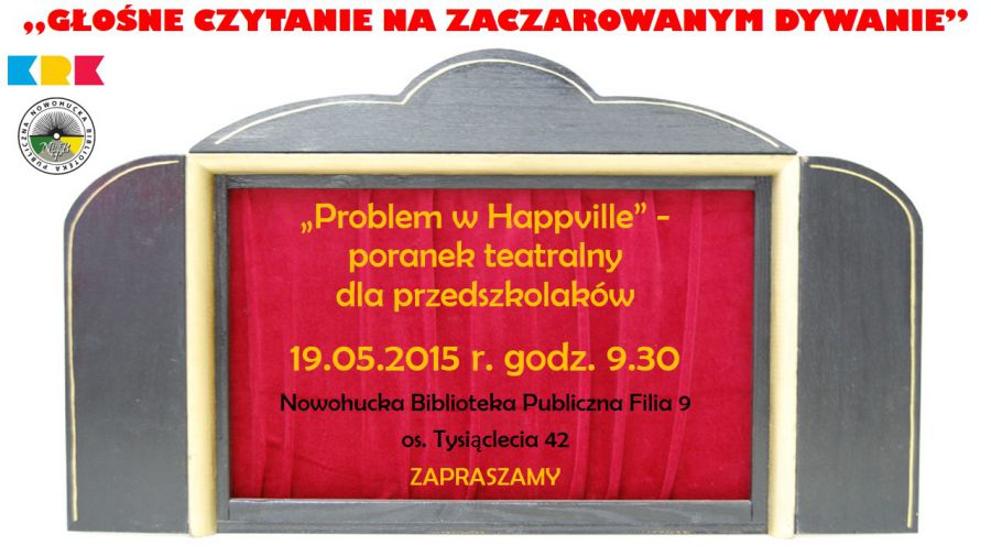 Problemy w Happville. Poranek z teatrzykiem Kamishibai dla przedszkolakw. W cyklu: Gone czytanie na zaczarowanym dywanie Biblioteka zaprasza na zajcia edukacyjno-literackie dzieci w wieku przedszkolnym. Uczestnicy spotkania poznaj histori teatrzyku kamishibai, wezm te udzia w niezwykym obrazkowym spektaklu, podczas ktrego poznaj przygody pana Peabodyego z miasteczka Happville.