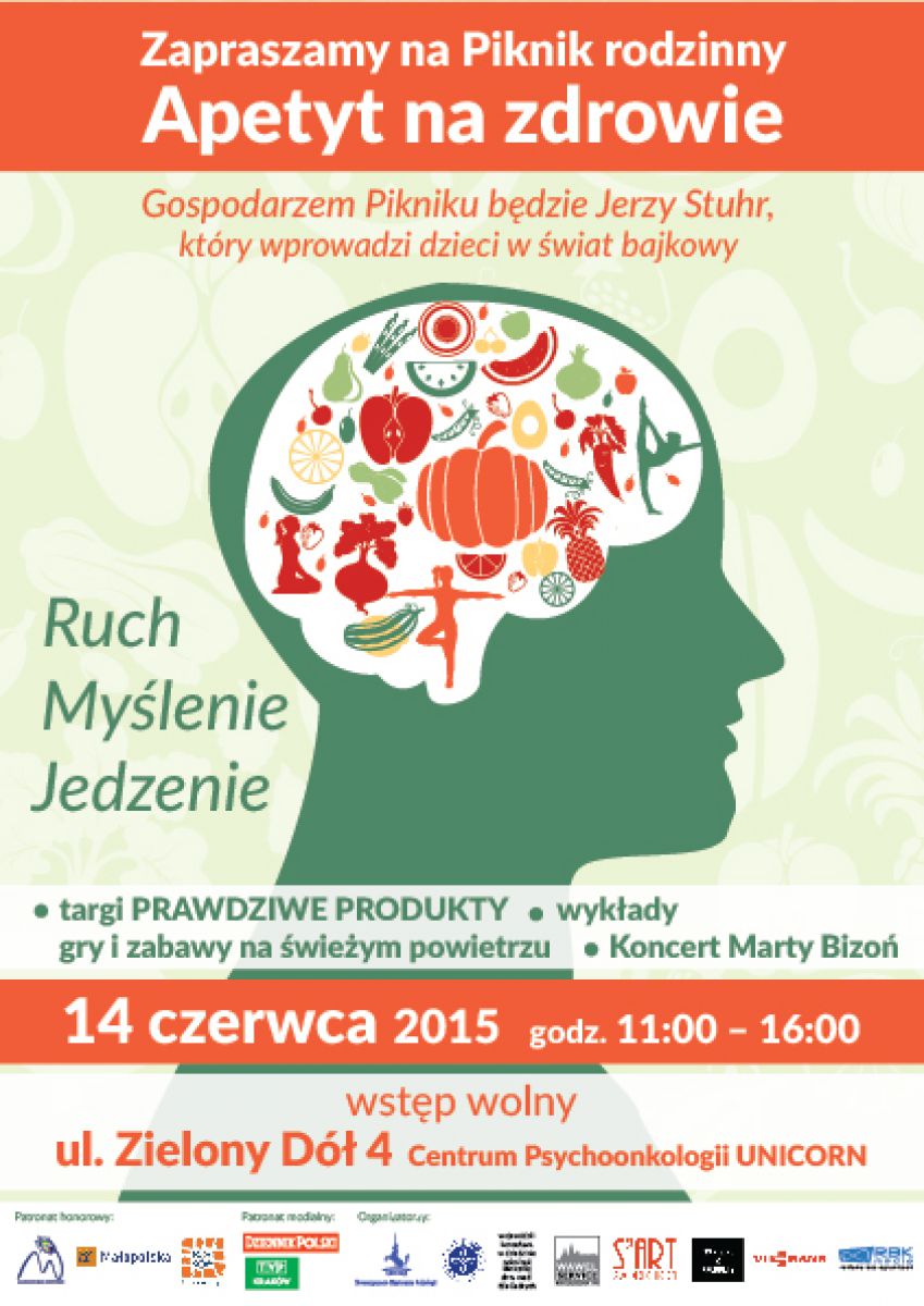 14 czerwca (niedziela) to dzień, w którym każdy mieszkaniec Krakowa będzie mógł najeœć się zdrowiem do syta. W Centrum Psychoonkologii UNICORN w Krakowie (ul. Zielony Dół 4) odbędzie się Rodzinny Piknik APETYT NA ZDROWIE. Celem spotkania jest szeroko rozumiana profilaktyka zdrowia i promocja zdrowego stylu życia. Wydarzenie kierowane jest do wszystkich mieszkańców Krakowa, a w szczególnoœci rodzin z dziećmi oraz osób starszych.