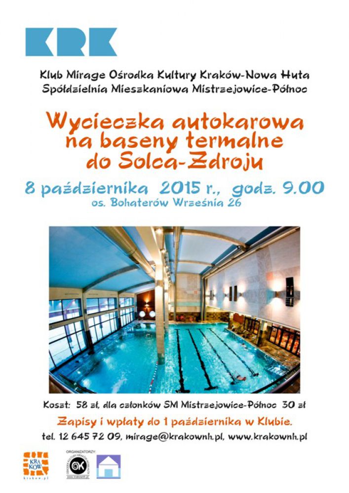 Klub Mirage Oœrodka Kultury Kraków-Nowa Huta i Spółdzielnia Mieszkaniowa Mistrzejowice-Północ zapraszajš seniorów i dorosłych na wycieczkę do uzdrowiska położonego w niezwykle malowniczym regionie województwa œwiętokrzyskiego. Termin: 8 paŸdziernika o godz. 9.00 (os. Bohaterów Wrzeœnia 26). W programie wyjazdu do Solca znajdzie się: 2,5 godzinny pobyt na Basenach Mineralnych Solec-Zdrój oraz spacer po mieœcie. Zapisy i wpłaty do 1 paŸdziernika w Klubie.