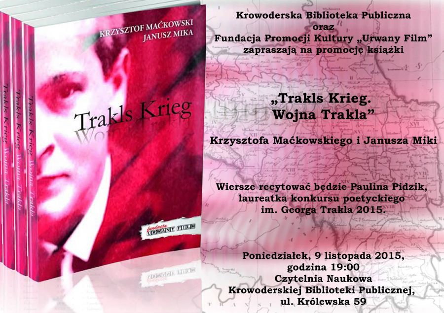 pt. "Trakls Krieg. Wojna Trakla". Wiersze recytowa bdzie Paulina Pidzik, laureatka konkursu poetyckiego im. Georga Trakla 2015. 9 listopada 2015 godz. 19:00.