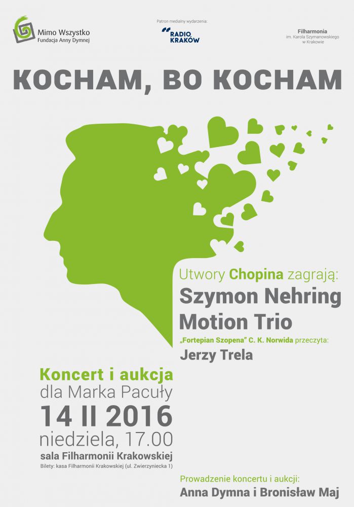 Fundacja Anny Dymnej „Mimo Wszystko” i Filharmonia Krakowska, już po raz ósmy, organizujš walentynkowy koncert charytatywny na rzecz chorych oraz niepełnosprawnych artystów znajdujšcych się w trudnej sytuacji materialnej. W tym roku zbierane będš pienišdze na rehabilitację Marka Pacuły, który – po wypadku w 2012 r. – przeszedł operację krwiaka mózgu, zapadł w œpišczkę i do dzisiaj wymaga 24-godzinnej opieki swojej małżonki Barbary Natkaniec-Pacuły. Koncertowi, którego tytuł brzmi: „Kocham, bo kocham”, towarzyszyć będzie aukcja piór, zegarków oraz Magicznych Przedmiotów ofiarowanych przez znane postacie naszego życia publicznego (m.in. Prezydenta Andrzeja Dudę, Jerzego Owsiaka, kard. Stanisława Dziwisza). Licytację poprowadzš Anna Dymna i Bronisław Maj.