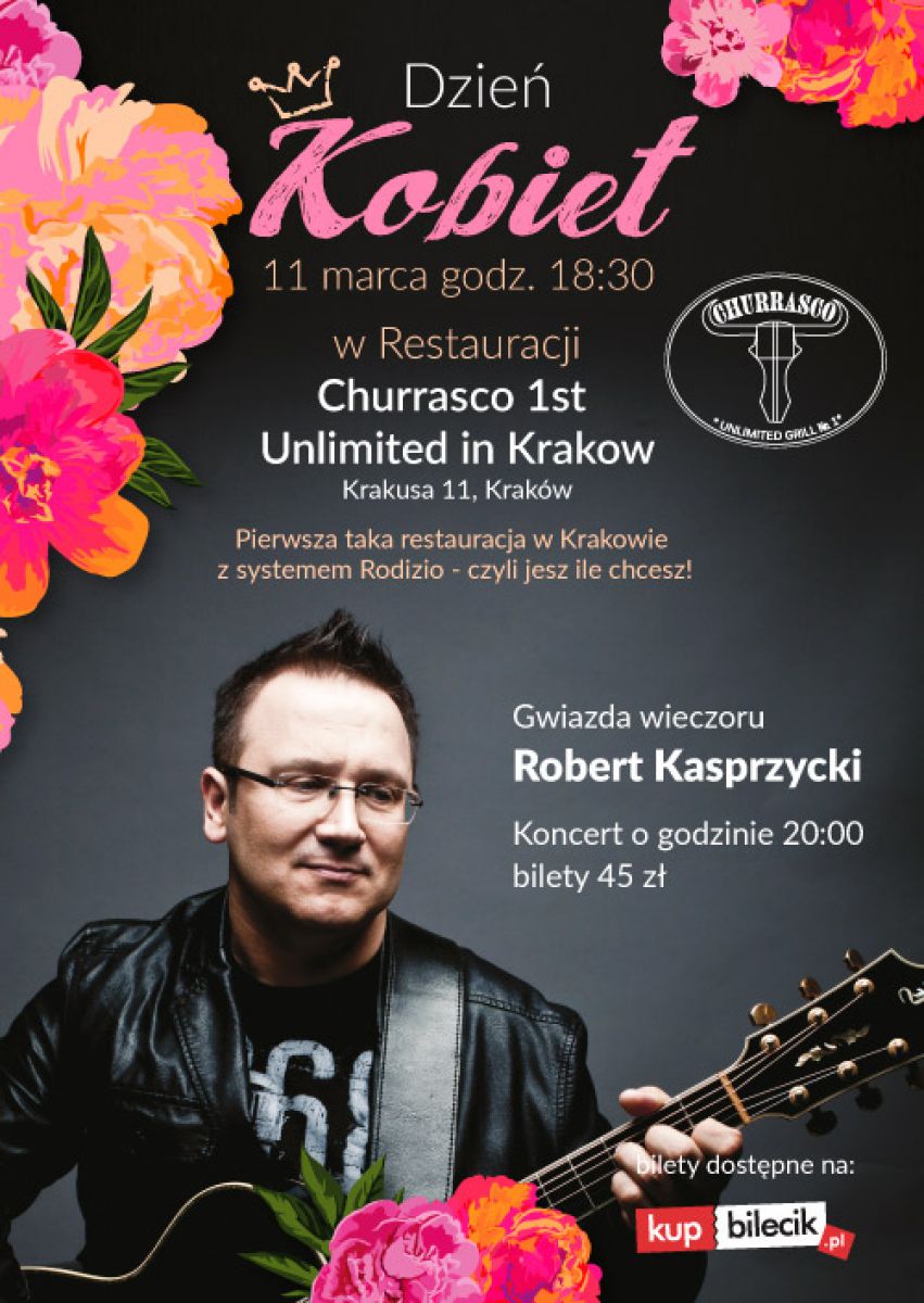 Restauracja Churrasco 1st Unlimited in Krakow to pierwsza restauracja na gastronomicznej mapie Krakowa z systemem rodizio - czyli jesz ile chcesz. 11 marca o 18:30 w restauracji organizowany jest Dzień Kobiet, podczas którego odbędzie się spotkanie z ekspertkami w dziedzinie urody: “Piękny uœmiech, piękna skóra, piękna Ty”, natomiast o 20:00 wystšpi gwiazda wieczoru - Robert Kasprzycki, który zagra utwory znane szerszej publicznoœci, pisane o kobietach i dla kobiet. Na pewno nie zabraknie takich przebojów jak: Niebo do wynajęcia, Naprawdę kocham deszcz, Zapiszę œniegiem w kominie, Jestem powietrzem, Trzymaj się wiatru kochana.