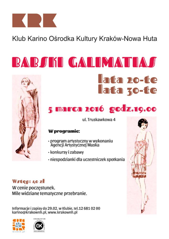 Kolejna impreza dla kobiet z cyklu Babski Galimatias w Klubie Karino Orodka Kultury Kraków-Nowa Huta (ul. Truskawkowa 4). Tym razem w stylu lat 20. i 30., zorganizowana również z okazji więta wszystkich pań, odbędzie się w sobotę 5.03. o godz. 19.00. Podczas imprezy odbędzie się pokaz mody oraz konkurs na najciekawszy strój z lat 20. i 30. Nie zabraknie ciekawych zabaw i konkursów, które poprowadzi lubiany przez uczestniczki babskich imprez Radosław Omieciński. Ciekawy program artystyczny, pyszny poczęstunek, a przede wszystkim duża dawka dobrego humoru gwarantujš, że impreza będzie udana.