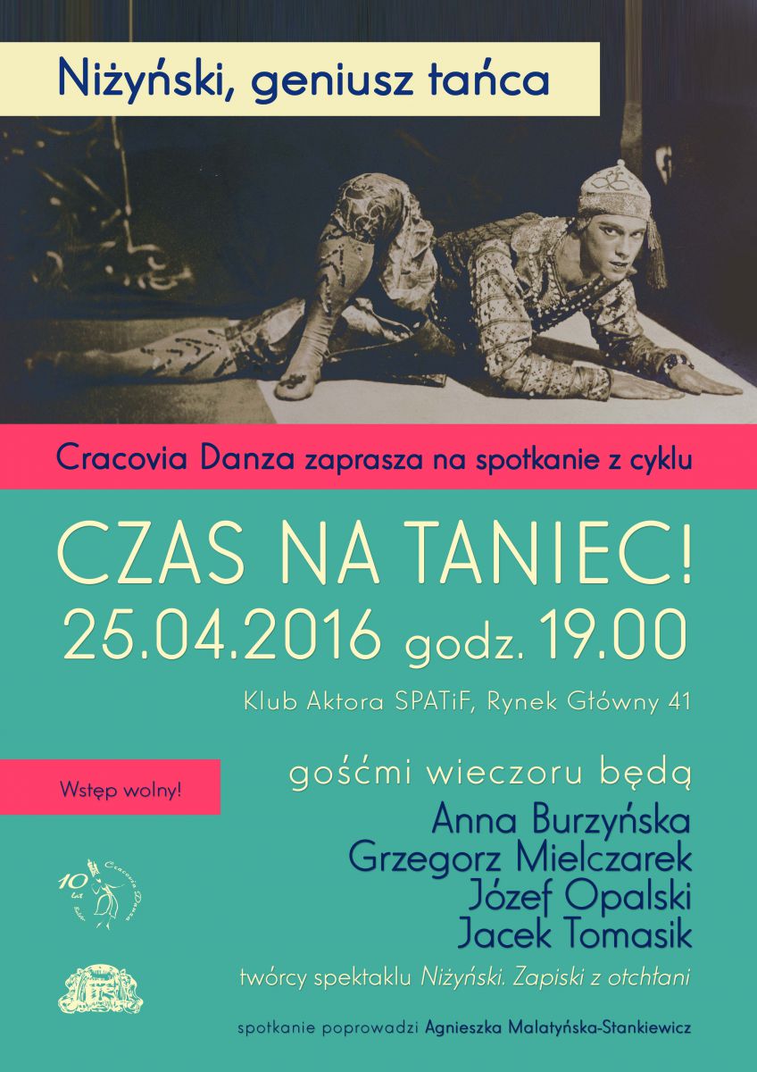 Wacław Niżyński, geniusz tańca będzie tematem kwietniowego spotkania CZAS NA TANIEC!, przypadajšcego tuż przed Międzynarodowym Dniem Tańca. Goćmi wieczoru będš twórcy spektaklu Niżyński, zapiski z otchłani: Anna Burzyńska (autorka sztuki), Grzegorz Mielczarek (odtwórca tytułowej roli), Józef Opalski (reżyser) i Jacek Tomasik (choreograf). Spotkanie poprowadzi redaktor Agnieszka Malatyńska-Stankiewicz.