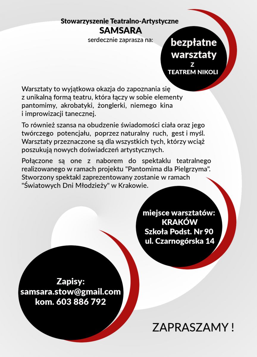 Iloœć miejsc jest ograniczona. Zgłoszenia należy wysyłać na adres Stowarzyszenia Teatralno-Artystycznego „Samsara“: samsara.stow@gmail.com