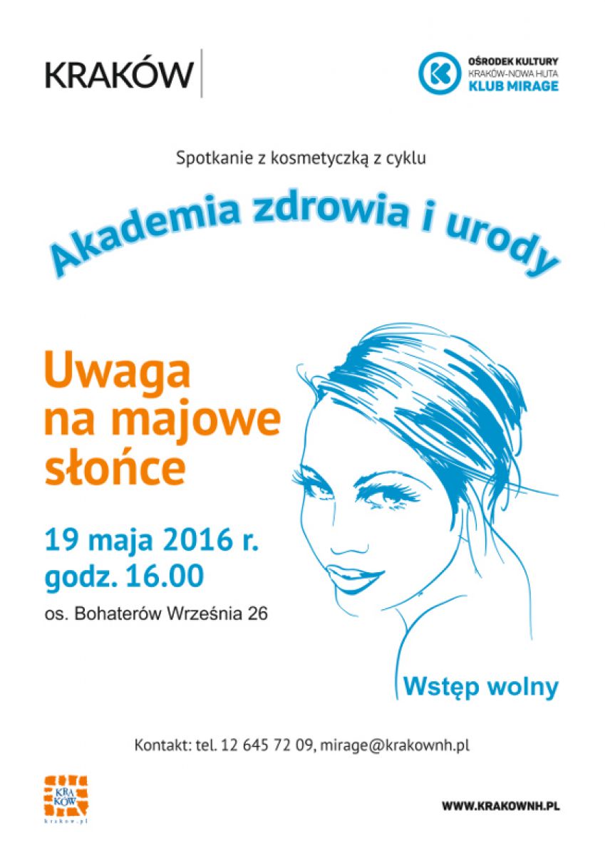 Spotkanie z konsultantkami kosmetycznymi dla pań w ramach cyklu Akademia Zdrowia i Urody, które odbywajš się w Klubie Mirage Oœrodka Kultury Kraków-Nowa Huta (os. Bohaterów Wrzeœnia 26). W najpiękniejszym miesišcu - maju, a dokładniej 19 maja o godz. 16:00 mówić będziemy o szkodliwych właœciwoœciach nieumiejętnego korzystania ze słońca. Poœwiecimy także czas na rozmowę o maseczkach do twarzy, które bywajš często postrzegane jako zbędne lub nieskuteczne a w rzeczywistoœci sš jednym z ważniejszych elementów rytuału pielęgnacyjnego. Każdy doœwiadczony ekspert powie nam, że ich regularne stosowanie jest niezbędne aby zapewnić skórze blask. Na spotkaniu kosmetyczka przybliży typy maseczek i dobierze je do cery. Przedstawi również kilka przepisów na sprawdzone domowe maseczki oraz udzieli indywidualnych porad.