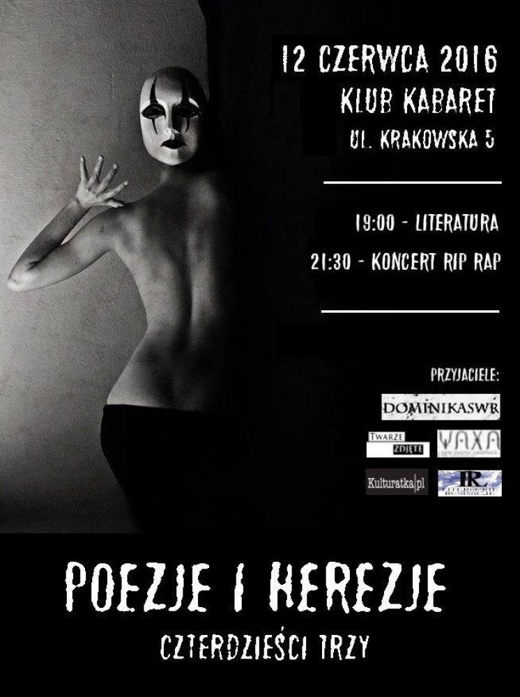 Zapraszamy Państwa na czterdzieste trzecie Poezje i herezje. Zobaczymy się po raz ostatni przed wakacjami, a ugoœci nas, po raz kolejny, Klub Kabaret. Tym razem zaczniemy o godzinie 19:00, bo dochodzš nas słuchy, że kolidujemy z meczem, przez który częœci z Pańswa bylibyœmy mniej po drodze.