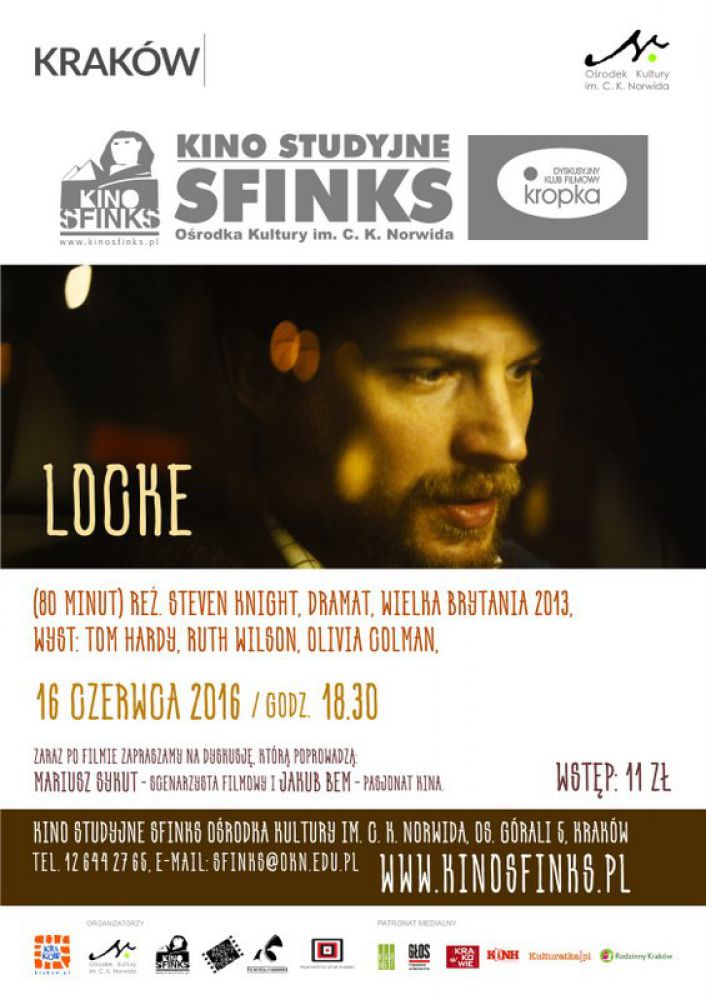 Dyskusyjny Klub Filmowy „Kropka” zaprasza 16 czerwca o godz.18.00 na film pt. „Locke” w reżyserii Stevena Knighta. Po seansie odbędzie się dyskusja, którš poprowadzš: scenarzysta Mariusz Sykut i Jakub Bem miłoœnik kina.