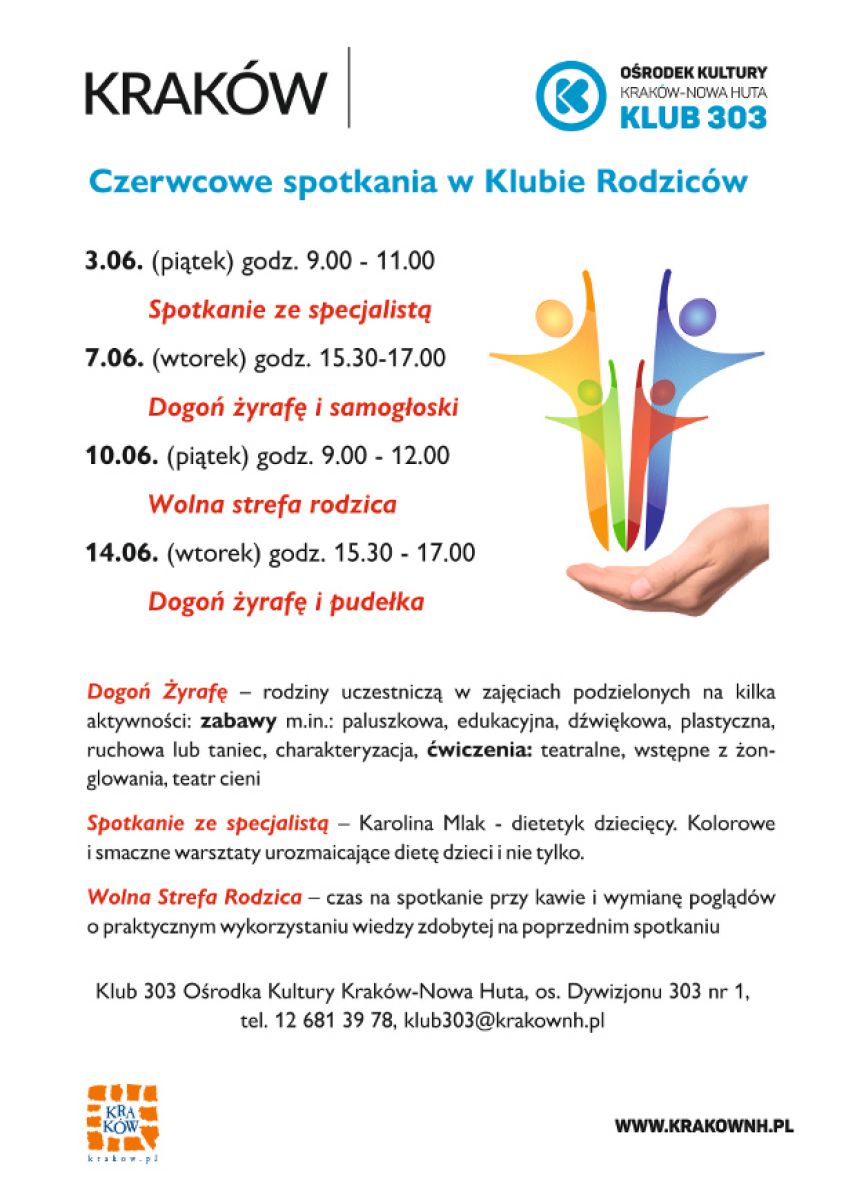 Klub 303 Orodka Kultury Kraków-Nowa Huta (os. Dywizjonu 303 nr 1) serdecznie zaprasza na kolejne spotkanie w ramach Klubu Rodziców. Wolna strefa rodzica jest to czas na miłe spędzenie przedpołudnia, odbędzie się ona 10 czerwca o godz. 9:00. Podczas spotkań i warsztatów dla rodziców, dzieciom zapewnimy profesjonalnš opiekę pod okiem animatora-opiekuna. W Wolnej strefie rodzice znajdš również co do picia i drobne przekšski. Będzie to czas na rozmowę i złapanie oddechu pomiędzy codziennymi obowišzkami zapracowanego Rodzica.