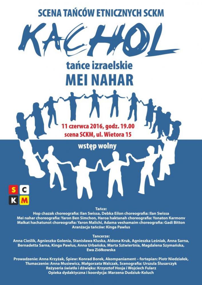 Grupa Kachol działajšca w Staromiejskim Centrum Kultury Młodzieży ma zaszczyt zaprosić Państwa w tanecznš podróż. Pasjonaci tańca pragnš przedstawić Państwu różnorodnoć i piękno ludowych tańców Izraela. A tańce izraelskie posiadajš pewien fenomen łšczšcy w sobie wpływy różnych kultur, sš nostalgiczne i pełne energii. Każdy może znaleć w nich co dla siebie. W programie tańce w stylu m.in. chasydzkim, jemeńskim oraz występ gocinny Konrada Borka, który uwietni koncert pieniami w języku hebrajskim.