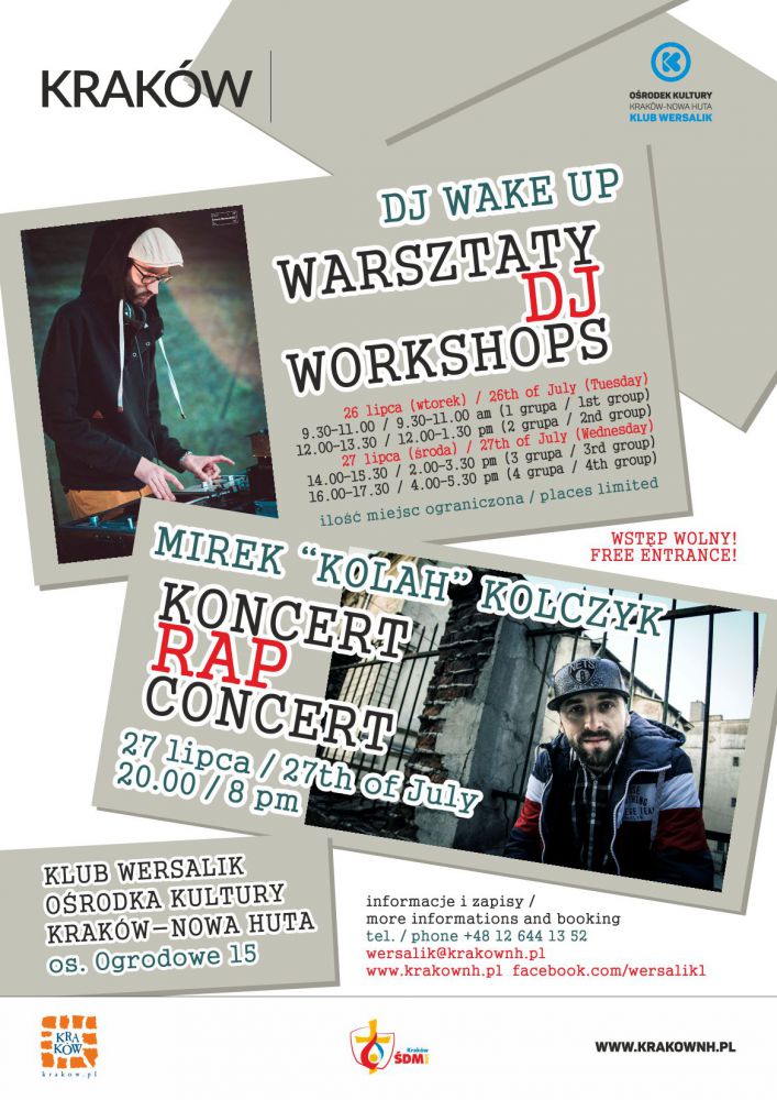 Klub Wersalik Oœrodka Kultury Kraków-Nowa Huta (os. Ogrodowe 15) zaprasza na warsztaty DJ wprowadzajšce w podstawy dj’ingu klubowego (miksowanie utworów muzycznych zgodnie z ich tempem („BPM” Beats Per Minute) oraz podstawš rytmicznš („Beat”, „Loop perkusyjny”). W programie warsztatów znajdš się prezentacja sztuki dj’skiej oraz procesu tworzenia nowego utworu, zapoznanie się z podstawowym sprzętem dj’skim oraz producenckim, odtwarzanie muzyki w sposób „zdiggitalizowany” za pomocš komputera ze specjalnym oprogramowaniem, prezentacja klasycznej maszyny producenckiej Akai MPC 2000, dla uczestników możliwoœć spróbowania swoich sił w składaniu gotowych sampli na programie Hip Hop E-Jay. Prowadzšcym warsztaty będzie DJ Wake Up – DJ klubowy i kolekcjoner płyt winylowych, reprezentant krakowskiego kolektywu Kalepusz Crew. Współpracował, m.in. z Estropicall DeeJays, Rewelacyjni Hydrofoniks, Nibyland Sound System, a także współorganizował festiwalowe imprezy i warsztaty bębniarskie na Slot Fest "O Wschodzie" (Stowarzyszenie Lokalnych Oœrodków Twórczych "SLOT"). Jako bębniarz miał okazję zaprezentować się w czeskiej Opavie i Pradze. Supportował takich artystów jak: Czesław Œpiewa, Ada Rusowicz. Występował na jednej scenie z wieloma znanymi dj'ami.
