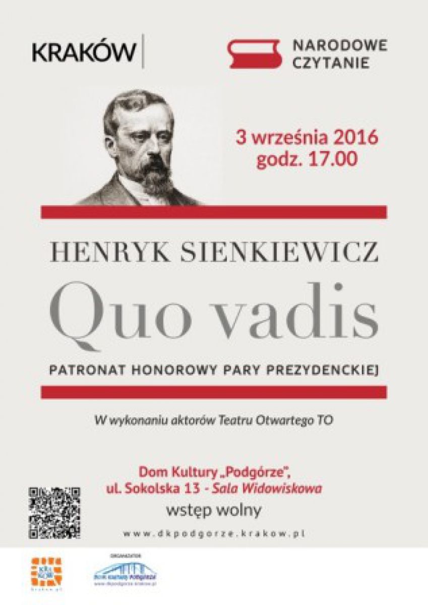 Rok 2016 ogłoszony został rokiem Henryka Sienkiewicza.3 wrzeœnia o godzinie 17.00 w Domu Kultury "Podgórze" odbędzie się Narodowe Czytanie "Quo vadis".