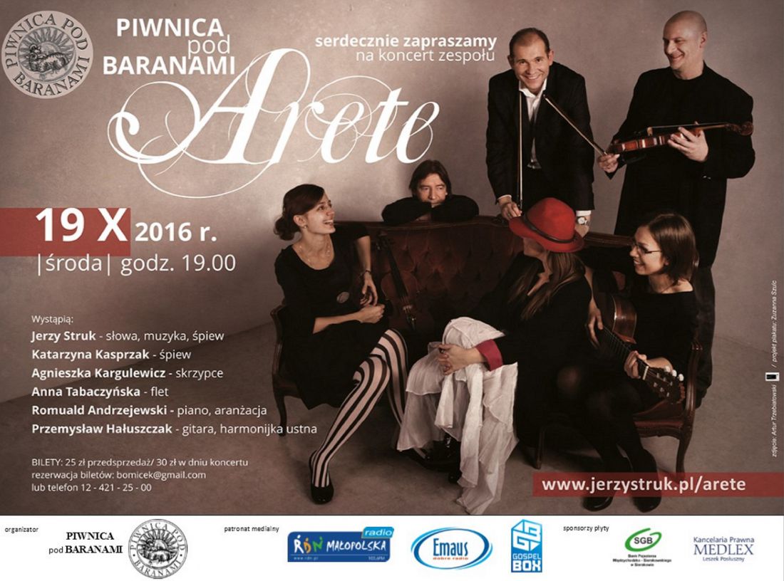 Serdecznie zapraszamy do pięknego Krakowa na koncert zespołu Arete w PIWNICY POD BARANAMI 19 padziernika (roda), 2016r. godz. 19.00