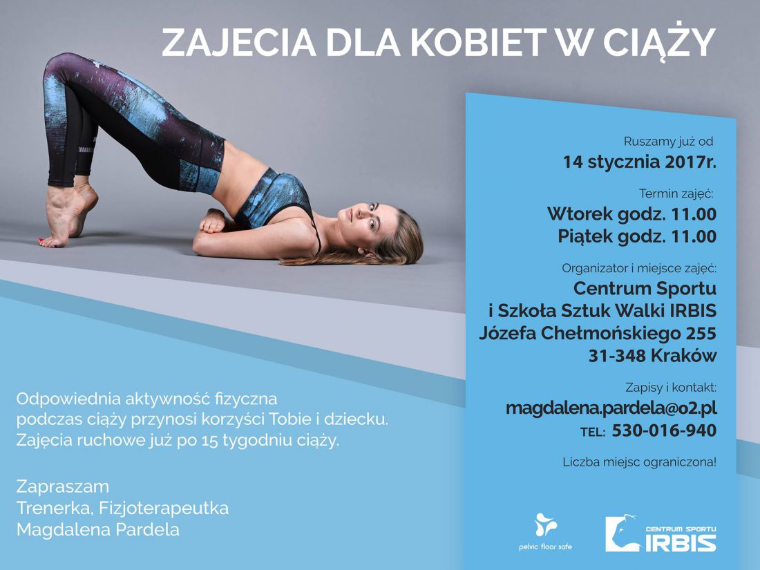 Zapraszam na pierwsze zajęcia poranne w Centrum Sportu IRBIS skierowane do kobiet w cišży 14 lutego 2017. Treningi prowadzi Magdalena Pardela, fizjoterapeutka oraz certyfikowana trenerka Pelvic Floor Safe – PFSŽ – trening bezpieczny dla kobiet z włšczeniem do zajęć ćwiczeń dna miednicy . Zajęcia dla kobiet już po 15 tygodniu cišży.