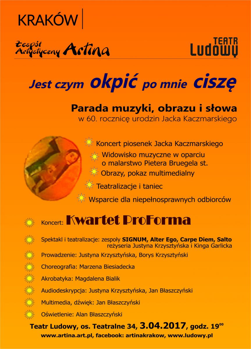 W poniedziałek 3.04.2017 o godz. 19:00 w Teatrze Ludowym odbędzie się parada muzyki, obrazu i słowa pt. "Jest czym okpić po mnie ciszę". Będzie to już jedenasta edycja wydarzenia organizowanego przez Zespół Artystyczny ARTINA.