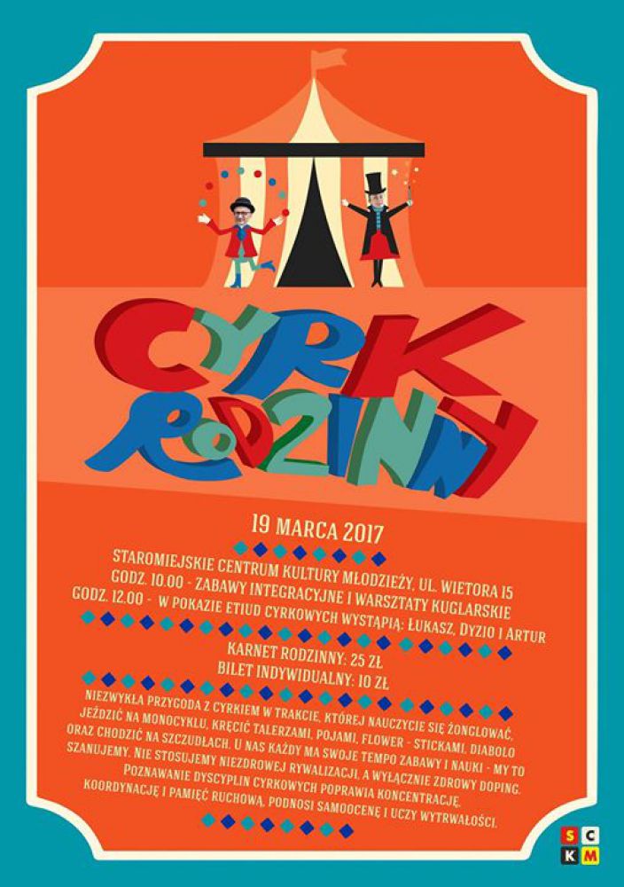 19 marca 2017 r., godz. 10.00 warsztaty cyrkowe, godz. 12.00 pokaz cyrkowy w wykonaniu absolwentów SCKM - Łukasza, Dyzia i Artura.