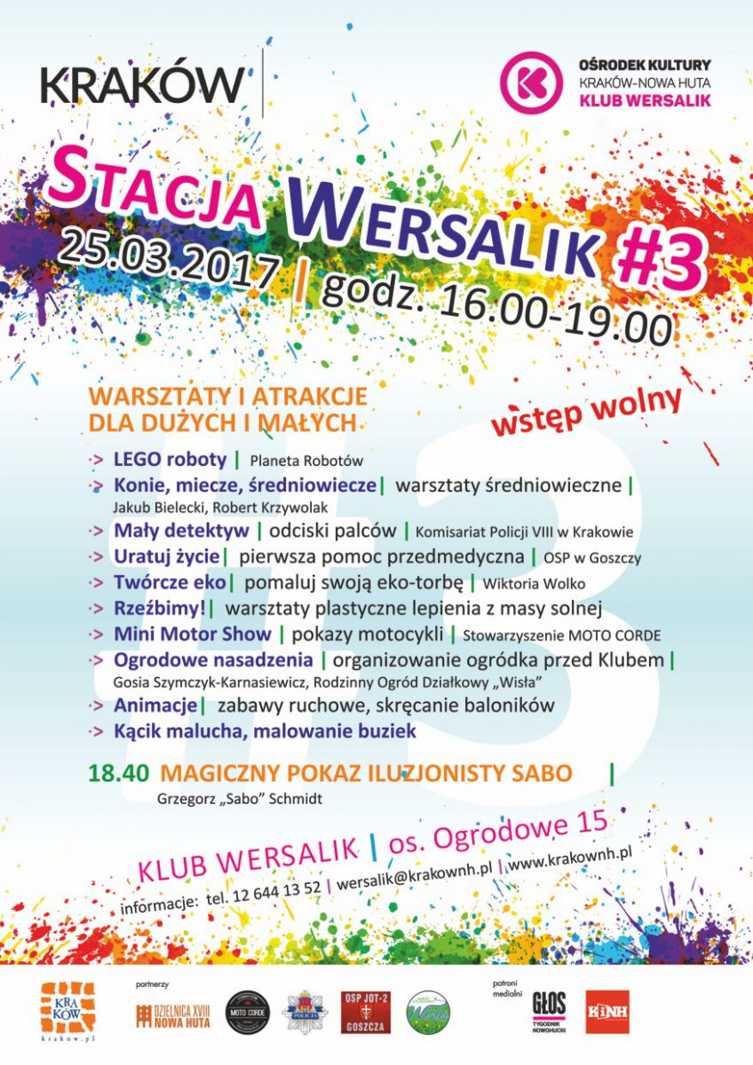 Podczas tegorocznej edycji Stacji Wersalik Klub przygotował atrakcyjne propozycje. Wród nich Planeta Robotów gdzie zgłębić będzie można technologię Lego robotów. To połšczenie techniki i dobrej zabawy, polecane szczególnie chłopcom tym małym i tym większym. Konie, miecze, redniowiecze to propozycja warsztatów historycznych, które przeniosš uczestników w czasy rycerstwa i gotyku. Małych fanów Sherlocka Holmesa, Klub zaprasza do udziału w warsztatach prowadzonych przez policjantów z Komisariatu VIII w Krakowie, podczas których dzieciaki spróbujš swoich sił m.in. w zbieraniu odcisków palców. Na wszystkich, którzy będš chcieli wyżyć się twórczo, czekać będš eko-warsztaty plastyczne i warsztaty rzebienia z masy solnej. Dla fanów motoryzacji nie lada gratkš będzie Mini Motor Show pokaz przygotowany przez Stowarzyszenie MOTO CORDE. W programie zaplanowano także wspólne organizowanie ogródka i sadzenie kwiatów przed Klubem, rozmaite zabawy ruchowe i animacje. Dla najmłodszych nie zabraknie malowania buziek i kšcika, w którym maluszki będš mogły zajšć się rysowaniem i kolorowaniem.