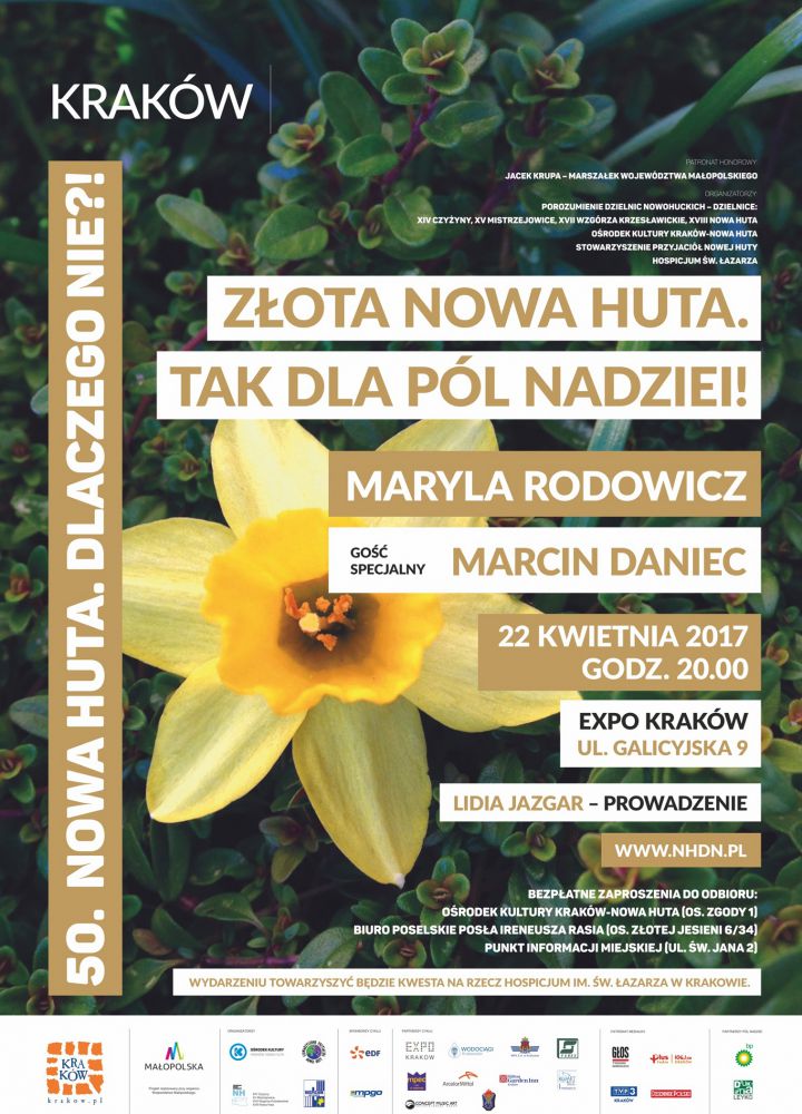 22 kwietnia br. o godz. 20.00 organizatorzy cyklu Nowa Huta. Dlaczego Nie?! zapraszajš na jubileuszowy 50. koncert który odbędzie się w Międzynarodowym Centrum Targowo-Kongresowym EXPO Kraków (ul. Galicyjska 9). Wydarzenie będzie realizowane w ramach corocznej akcji Pola Nadziei, stšd jego tytuł Złota Nowa Huta. Tak dla Pól Nadziei!.