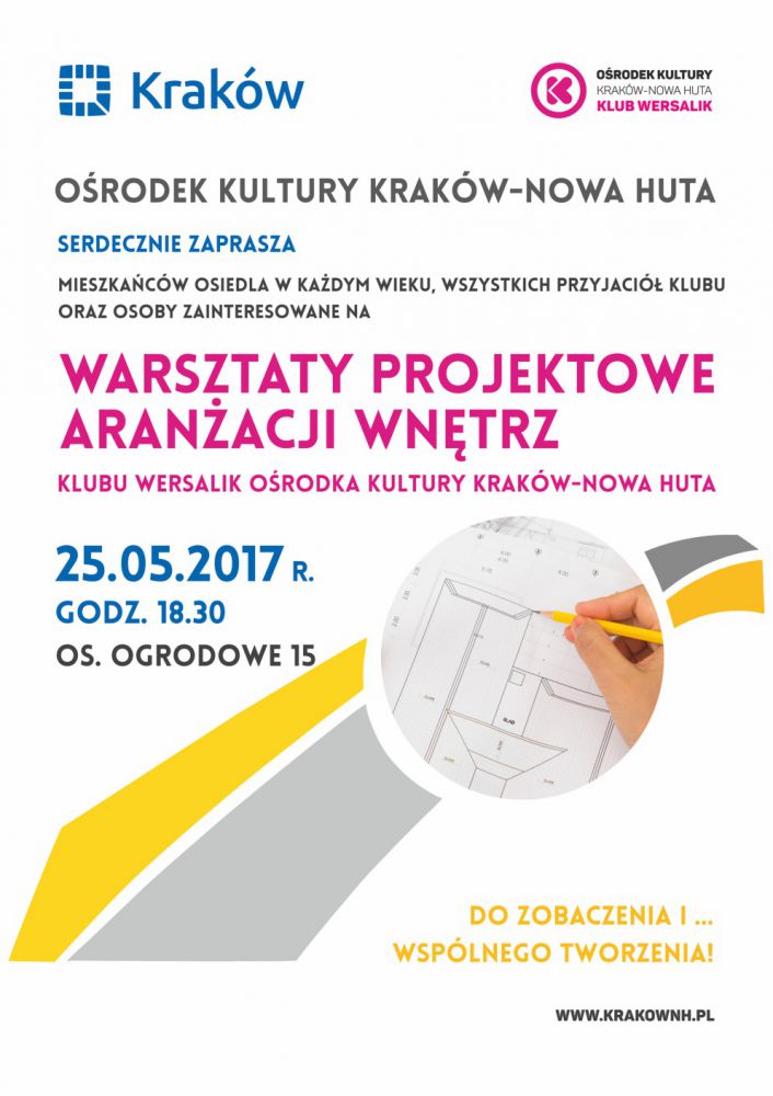 Klub Wersalik Oœrodka Kultury Kraków-Nowa Huta (os. Ogrodowe 15) serdecznie zaprasza wszystkich przyjaciół Klubu, mieszkańców Nowej Huty w każdym wieku oraz wszystkie zainteresowane osoby na Warsztaty projektowe aranżacji wnętrz Klubu Wersalik, które odbędš się 25 maja o godz. 18.30. Warsztaty majš na celu zebranie pomysłów od mieszkańców dotyczšcych aranżacji pomieszczeń Klubu (sali klubowej i sali przechodniej) w zakresie poprawy funkcjonalnoœci z dostosowaniem do działalnoœci Klubu. Wy też możecie mieć wpływ na to jak będzie wyglšdał Klub, który jest przestrzeniš stworzonš dla Was i waszych dzieci, do rozwijania Waszych pasji, zdobywania nowych umiejętnoœci i spędzania aktywnie oraz twórczo wolnego czasu.