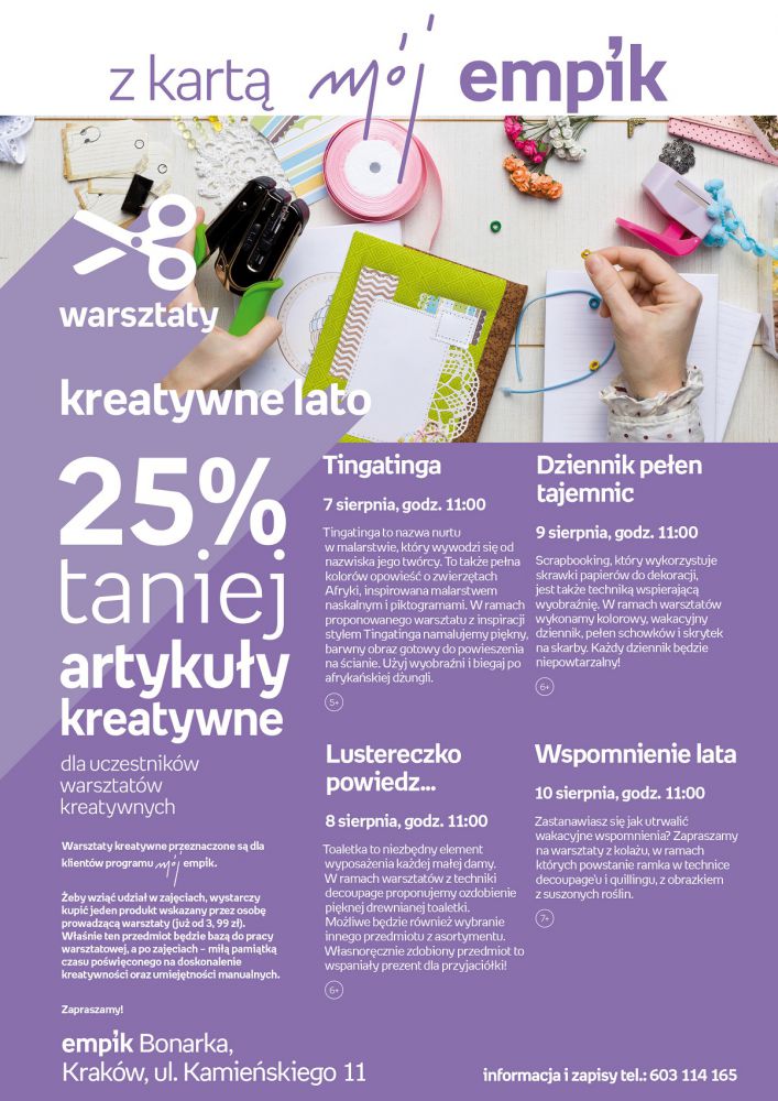 Warsztaty kreatywne przeznaczone dla klientów programu Mój Empik sš bezpłatne. Aby wzišć udział w zajęciach, wystarczy kupić jeden produkt wskazany przez osobę prowadzšcš warsztaty (koszt już od 3,99 zł). Właœnie ten przedmiot będzie bazš do pracy warsztatowej, a po zajęciach – miłš pamištkš czasu poœwięconego na doskonalenie kreatywnoœci i umiejętnoœci manualnych.