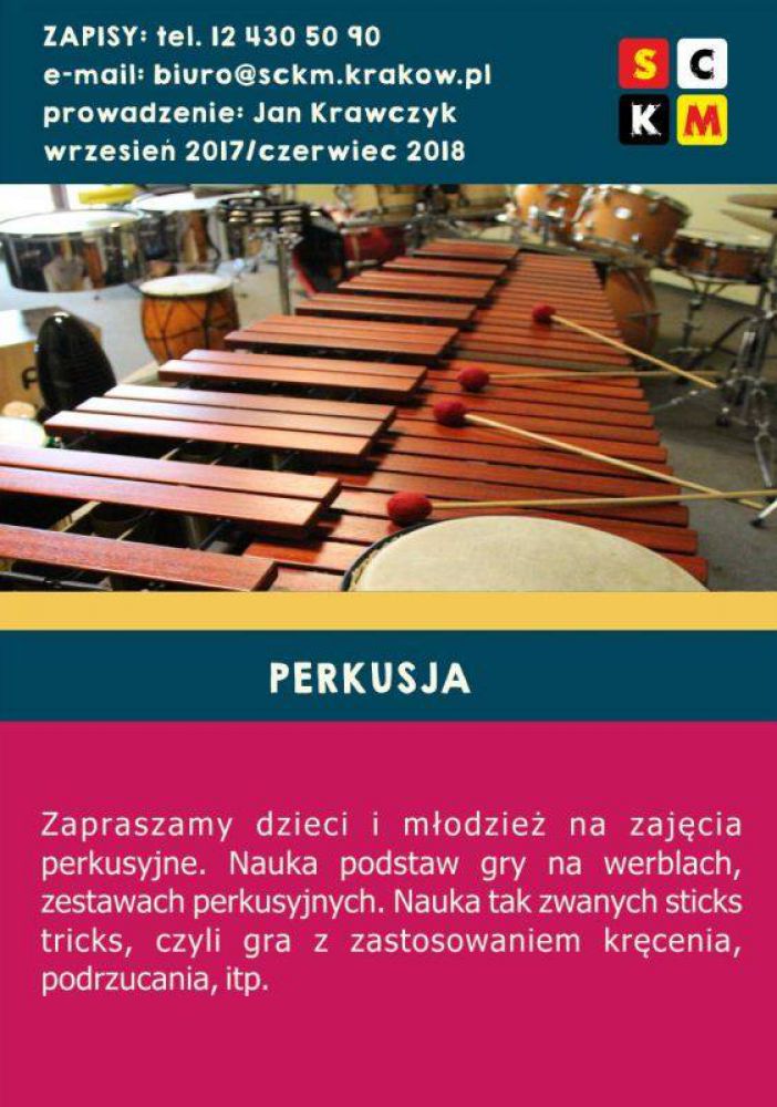 Zajęcia Perkusyjne - nauka podstaw gry na werblach, zestawach perkusyjnych. Nauka tak zwanych sticks tricks, czyli gra z zastosowaniem kręcenia, podrzucania, itp. Zajęcia dla dzieci i młodzieży w wieku od 9 do 24 lat w różnych grupach wiekowych.