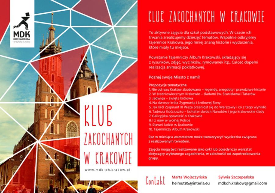 To aktywne zajęcia dla szkół podstawowych. W czasie ich trwania zrealizujemy dziesięć tematów. Wspólnie odkryjemy tajemnice Krakowa, jego mniej znanš historie i wydarzenia, które miały tu miejsce.