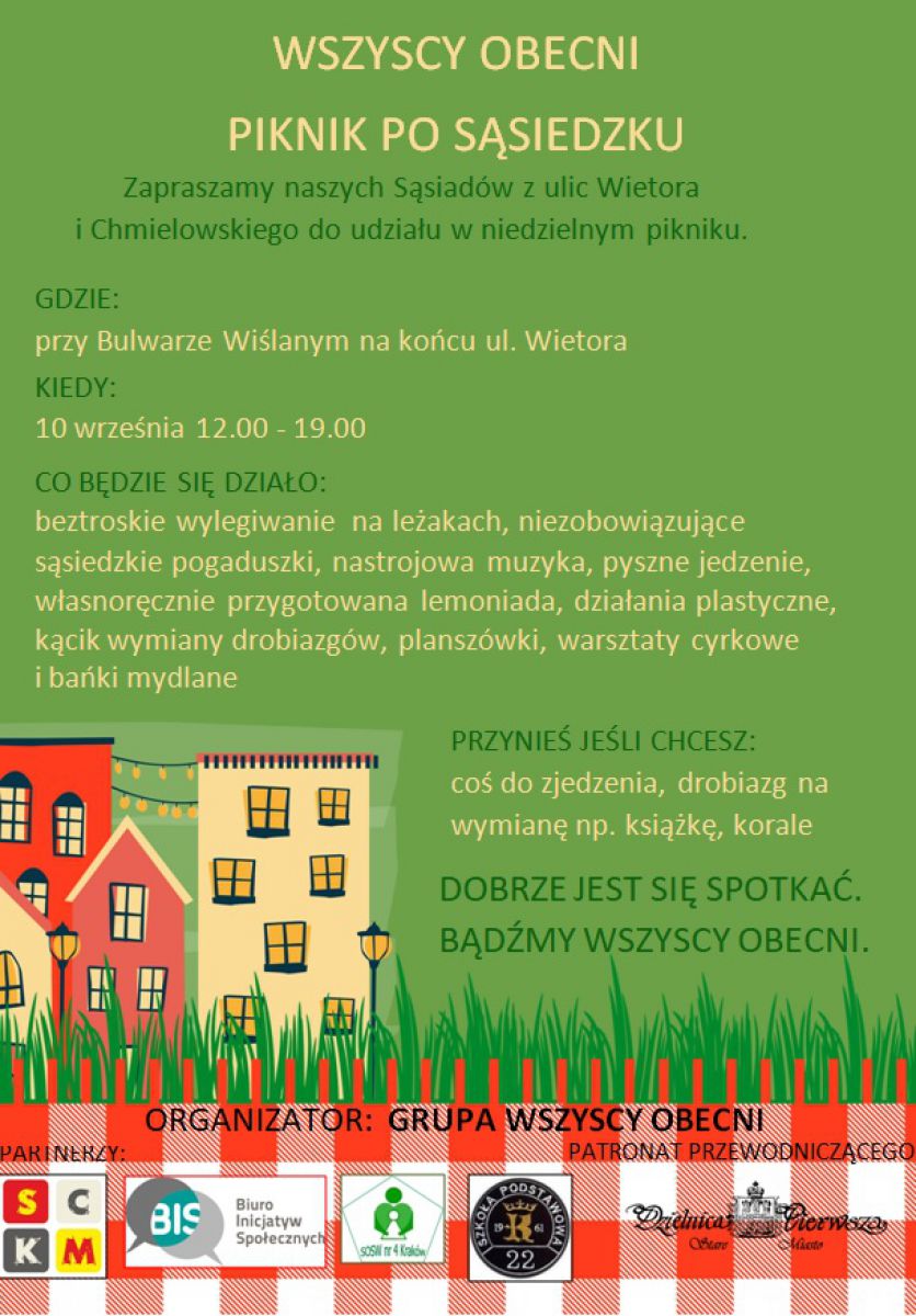 Mijamy się codziennie na chodniku, wymieniamy uprzejmoci na schodach, a prawie zupełnie się nie znamy. Dlatego zapraszamy Was do udziału we wspólnym pikniku naszych dwóch ulic - Wietora i Chmielowskiego.