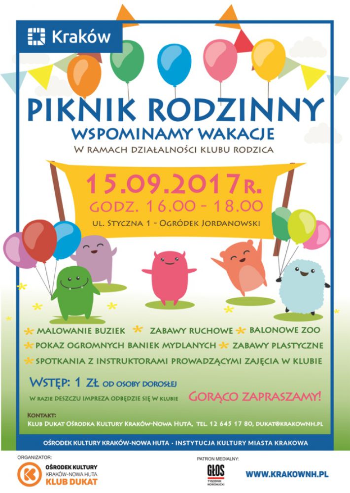 Powakacyjne zajęcia Klubu Rodziców w Klubie Dukat Orodka Kultury Kraków-Nowa Huta (ul. Styczna 1) rozpoczniemy wspólnym piknikiem, podczas którego będzie czas na rozmowę oraz wspólnš zabawę. Punktem kulminacyjnym spotkania będzie przygotowanie pocztówki z wakacji, wybranš przez uczestników technikš plastycznš. Zapraszamy 15 wrzenia w godz. 16.00-18.00.