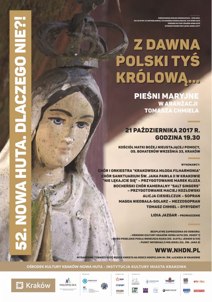 W padzierniku, który tak mocno zwišzany jest z kultem Matki Bożej, a także w roku obchodów 100-rocznicy objawień Matki Bożej w Fatimie, wraz z artystami, pochylimy się nad tekstami wielu dobrze znanych pieni maryjnych takich jak Królowej Anielskiej piewajmy, We w swš opiekę, Matko Najwiętsza, czy tytułowe Z dawna Polski Ty Królowš. Wykonawcami będš: Chór i Orkiestra "Krakowska Młoda Filharmonia", Chór Sanktuarium w. Jana Pawła II w Krakowie "Nie lękajcie się" - przygotowanie Marek Kluza, Bocheński Chór Kameralny "Salt Singers" - przygotowanie Maciej Kozłowski. Usłyszymy także solowe wystšpienia Alicji Ciesielczuk sopran i Magdy Niedbały-Solarz mezzosopran. Dyrygentem koncertu będzie Tomasz Chmiel. Koncert poprowadzi Dyrektor Artystyczny cyklu Lidia Jazgar.