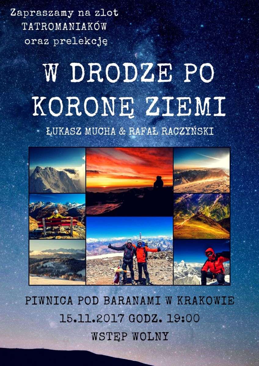 Podczas prelekcji zaprezentujemy Wam nasze poczštki na lokalnym podwórku - w Tatrach, gdzie regularnie trenujemy, spędzajšc w nich praktycznie każdy weekend. Dalej przeniesiemy się w Alpy, w których to wielokrotnie stanęlimy na Mont Blanc 4810 m n.p.m. Kolejny etap jest chyba oczywisty, czyli odsłoni się przed nami piękno Kaukazu ze swoim najwyższym szczytem - Elbrusem 5642 m n.p.m. Opowiemy Wam również o tegorocznych wyprawach na dach Ameryki Południowej, podczas której zdobylimy Aconcaguę 6962 m n.p.m oraz o "dachu czarnego lšdu", czyli afrykańskim Kilimandżaro 5895 m n.p.m.