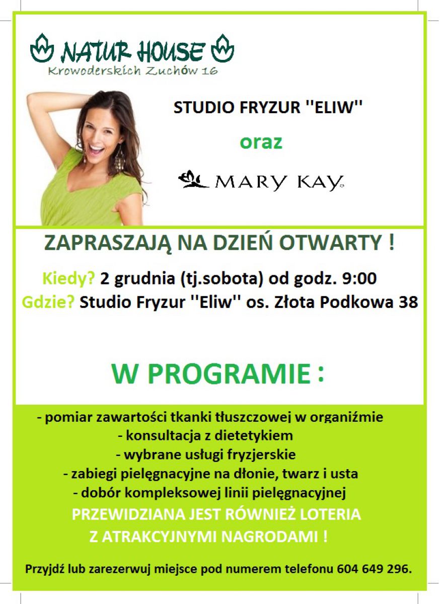 Naturhouse Krowoderskich Zuchów , Studio Fryzur ''Eliw'' oraz Mary Kay zapraszajš wszystkie Panie na dzień otwarty, gdzie całkowicie ZA DARMO będš Panie mogły skorzystać z naszych usług ! :)
