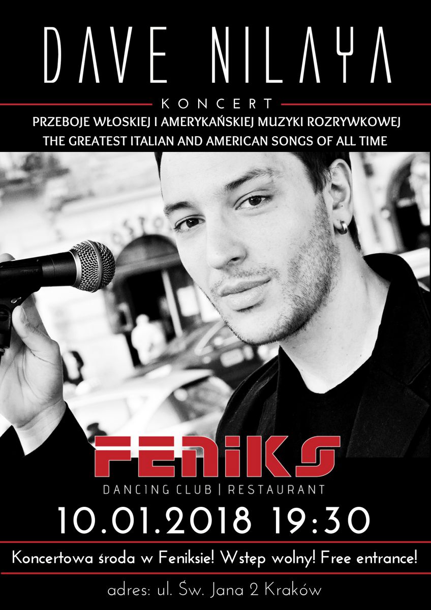Klub Feniks serdecznie zaprasza na koncert DAVE NILAYA - pochodzšcego z Wenecji, niezwykle utalentowanego wokalisty i kompozytora, którego Klub będzie miał przyjemnoć gocić na scenie już 10 stycznia!