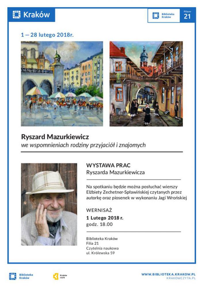 Wieczór wspomnień powięcony Ryszardowi Mazurkiewiczowi połšczony z wernisażem jego malarstwa. Na spotkaniu będzie można posłuchać wierszy Elżbiety Zechenter-Spławińskiej czytanych przez autorkę oraz piosenek w wykonaniu Jagi Wrońskiej.