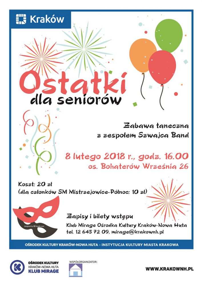 Klub Mirage Oœrodka Kultury Kraków-Nowa Huta (os. Bohaterów Wrzeœnia 26) zaprasza wszystkich seniorów w czwartek 8 lutego o godz. 16.00 do wspólnego uczczenia karnawału w szampańskim nastoju i przy skocznej muzyce. Tradycyjnie zabawa ostatkowa dla seniorów odbędzie się przy muzyce na żywo - do tańca przygrywać będzie zespół Szwajca Band, który umili wieczór dobrš muzykš oraz wspaniałym humorem. Zapisy wraz z wpłatš do 1 lutego w Klubie.