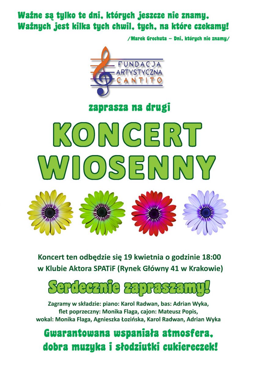 Koncert ten odbędzie się 19 kwietnia o godzinie 18:00 w Klubie Aktora SPATiF przy ulicy Rynek Główny 41 w Krakowie.
