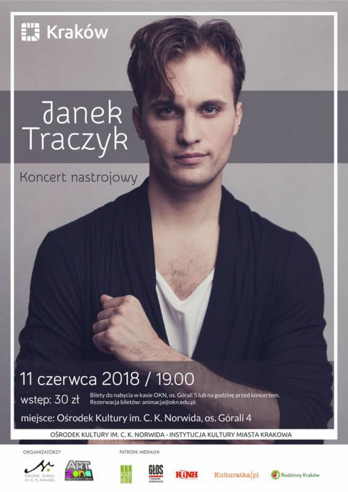 Czerwiec zapowiada się nastrojowo. Janek Traczyk, odtwórca głównych ról w musicalach "Piloci", "Notre Dame de Paris", "Metro". Uczestnik programów rozrywkowych takich jak "The Voice of Poland", "Must Be the Music", "Twoja Twarz Brzmi Znajomo" przyjeżdża do Krakowa, aby podzielić się z publicznociš pięknymi emocjami.