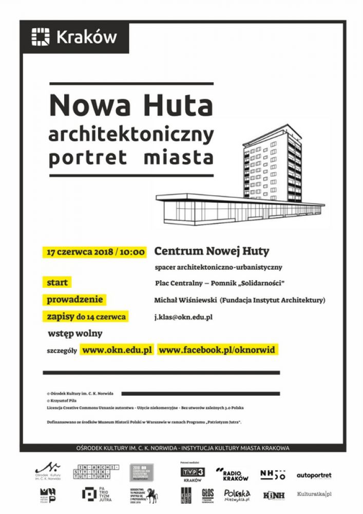 Nowa Huta architektoniczny portret miasta cykl działań animacyjno-edukacyjnych w postaci spacerów, zwiedzania lub prelekcji portretujšcych architektoniczne dziedzictwo kulturowe Nowej Huty z drugiej połowy XX w. W ramach przedsięwzięcia wydana zostanie recenzowana publikacja oraz zaprojektowane będš tzw. ikony miejskie, czyli schematyczne rysunki-piktogramy przedstawiajšce najważniejsze obiekty na bazie których powstanie seria gadżetów promujšcych lokalne dziedzictwo kulturowe.