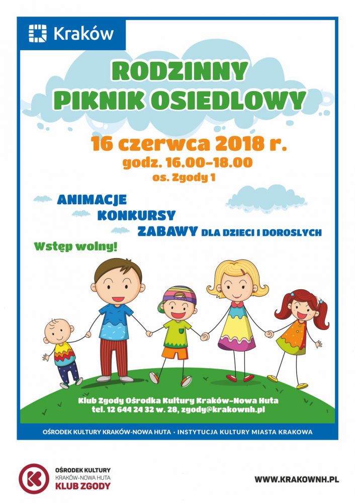 Klub Zgody Orodka Kultury Krakw-Nowa Huta (os. Zgody 1) 16 czerwca o godz. 16.00 zaprasza swoich ssiadw z osiedla Zgody na piknik rodzinny. W programie przewidziano liczne zabawy podwrkowe, kcik plastyczny, gry stolikowe, puszczanie baniek mydlanych, zabawy z chust animacyjn, szarf i woreczkami, krgle oraz inne atrakcje.