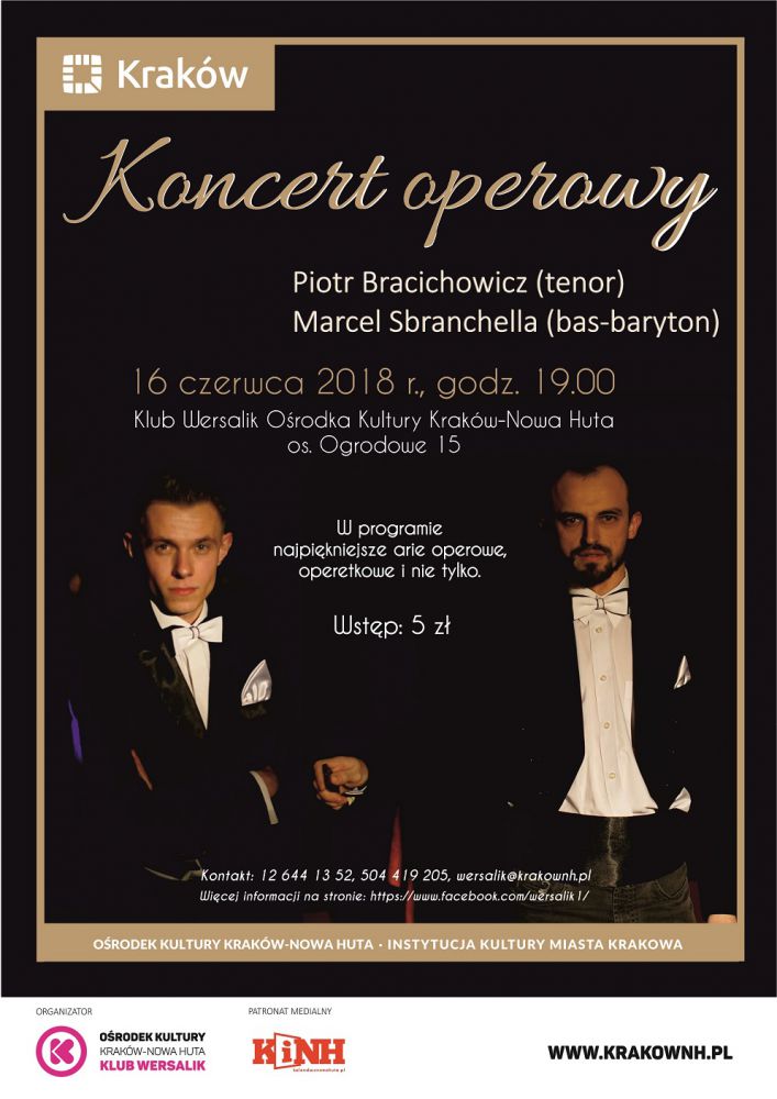 Klub Wersalik Orodka Kultury Kraków-Nowa Huta (os. Ogrodowe 15) zaprasza 16 czerwca o godz. 19.00 na Koncert operowy. W letni sobotni wieczór, za sprawš koncertu muzyki poważnej w Klubie Wersalik, nad osiedle Ogrodowe popłynš dwięki pieni znanych z najsłynniejszych oper i operetek wiata. Publicznoć usłyszy między innymi utwory z opery Cyrulik sewilski do muzyki Gioacchina Rossiniego, arię Graj Cyganie z operetki "Hrabina Marica" czy najsłynniejszš chyba pień neapolitańskš O sole mio w wykonaniu tenora Piotra Bracichowicza. Z kolei piewajšcy bas barytonem Marcel Sbranchella zaprezentuje m.in. arię Non piu andrai z opery Wesele Figara, Votre toast (znane jako Aria albo Pień Torreadora) z opery Carmen G. Bizeta, a także pień Ten zegar stary z opery Straszny dwór Stanisława Moniuszki. Serdecznie zapraszamy!