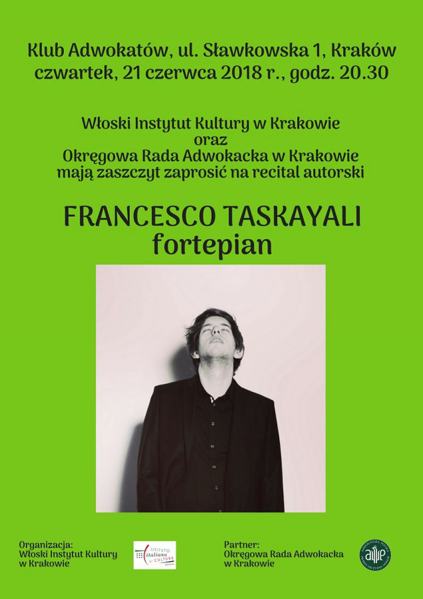Włoski Instytut w Krakowie oraz Okręgowa Rada Adwokacka w Krakowie zapraszajš na recital autorski włoskiego pianisty Francesco Taskayali.