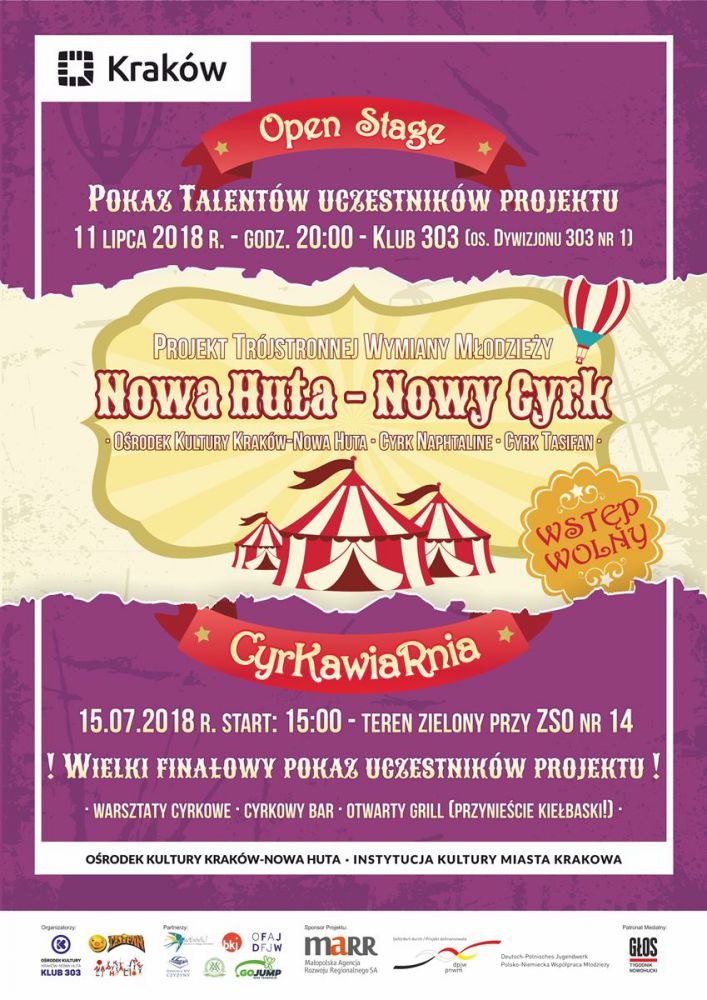 Klub 303 Orodka Kultury Kraków-Nowa Huta (os. Dywizjonu 303 nr 1) zaprasza 11 lipca 2018 r. o godz. 20:00 na Otwartš scenę, czyli pokazy solowe i układy zespołowe cyrkowców z Polski, Francji i Niemiec. Częć pokazów będzie wyreżyserowana, a częć improwizowana. Ideš przywiecajšcš Otwartej scenie jest wspólna zabawa.