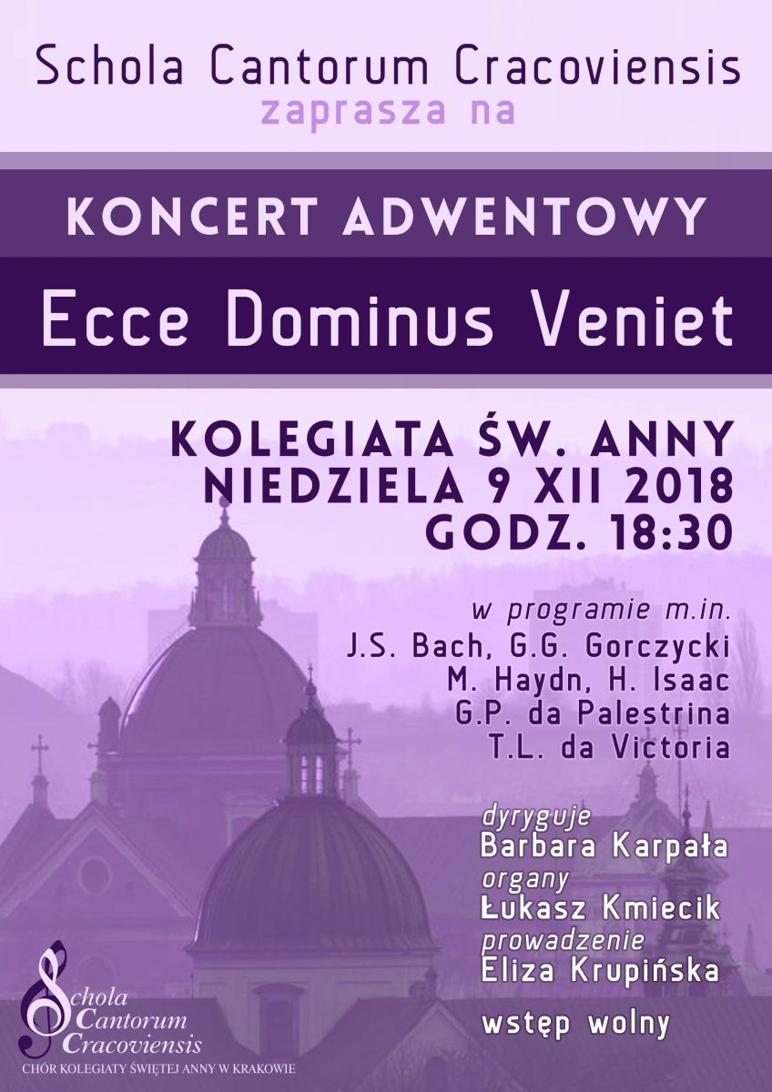 Chór Kolegiaty œw. Anny Schola Cantorum Cracoviensis zaprasza na koncert adwentowy "Ecce Dominus Veniet" niedziela 9 grudnia 2018, godz. 18:30, Kolegiata œw. Anny