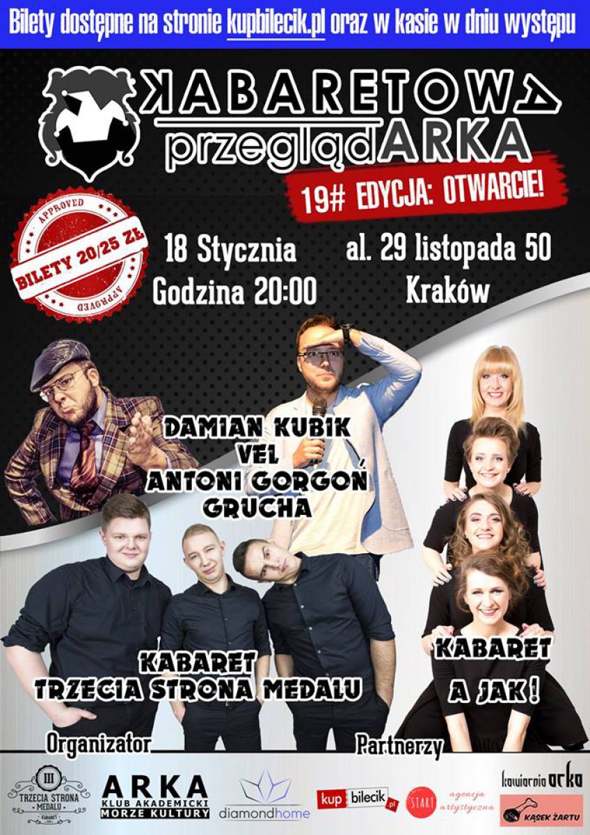 Nowy rok otwieramy z przytupem! Już dzi zapraszamy Was na kolejnš edycję Kabaretowej PrzeglšdARKI! 19# Edycja będzie pokazem sił gospodarzy. A w programie niezmiennie kabaret z wyglšdu i podejcia typowo męskiego, Stand-up + One Man Show oraz kabaret całkowicie, niepodważalnie i nieodwracalnie żeński! W repertuarze obowišzkowo piosenki i skecz wspólny. Specjalnie dla Was pełna różnorodnoć humorystyczna i komediowa. A dokładniej: